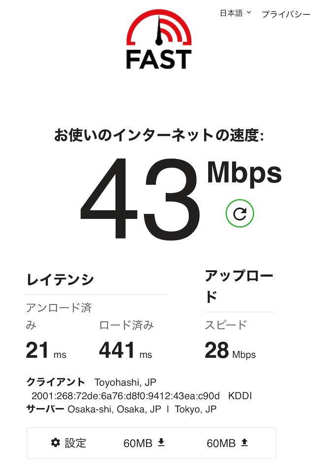 客室には通常のWifiと5GWifiがあり5Gでの計測となりますが、ここまで出ればどんな仕事でも特に問題なく作業ができるはずです。ちなみに通常wifiは非常に低速でオンラインMTGなどは難しそうでした。